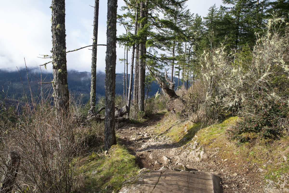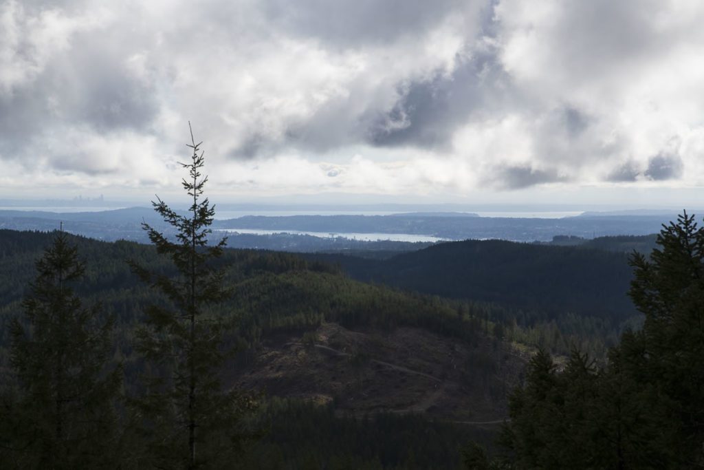 There are some nice forest views and some invigorating grades (>30°) as you continue along south. As you gain elevation, you are treated to several peek-a-boo vista views. We had cloud cover limiting the view but could see east to Seattle, the Cascades remaining hidden behind the clouds.