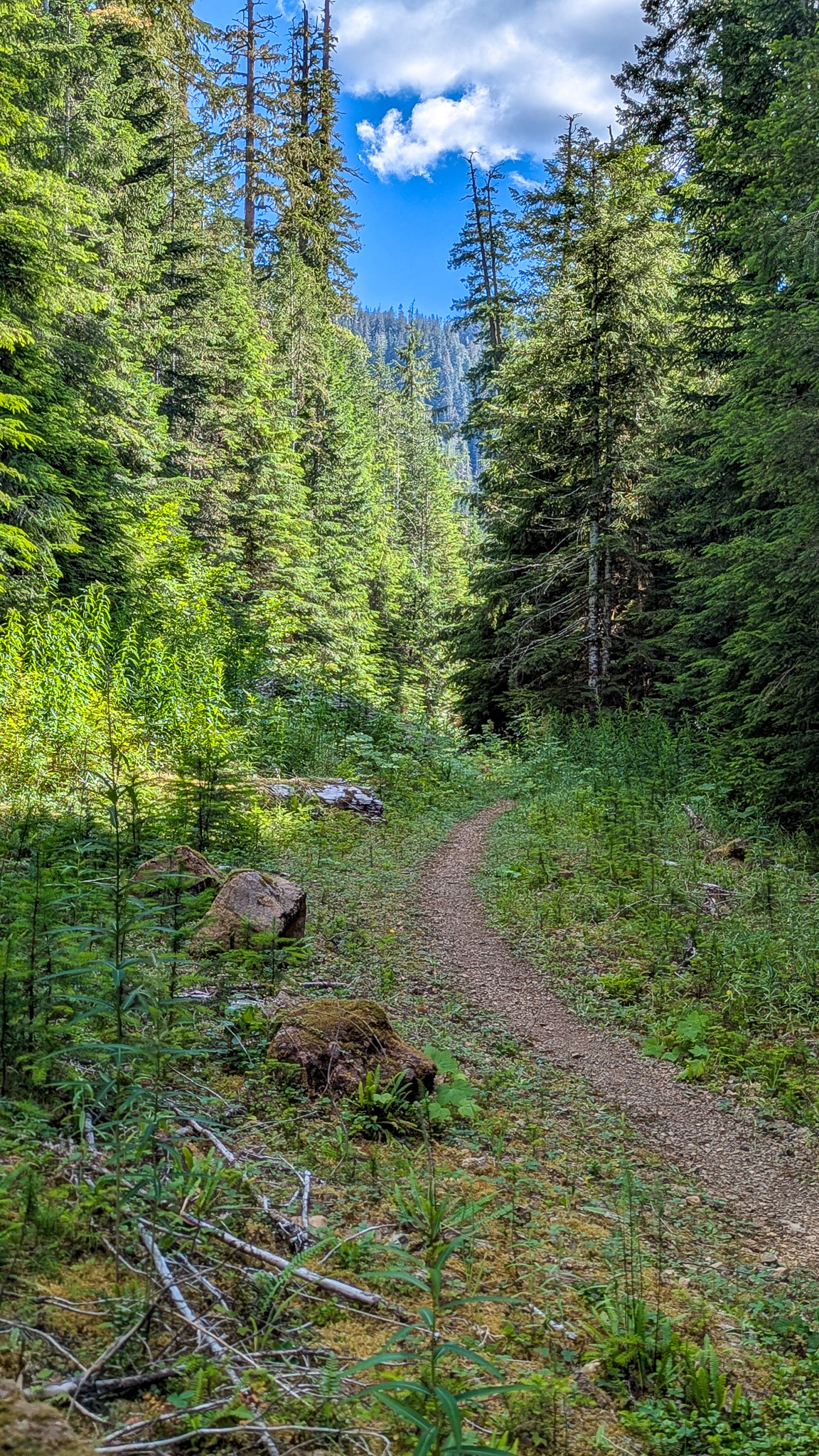 The trail follows an abandoned logging road, so for the most part this isn’t a soft, forest-floor hike. Trails built for foot traffic often twist and turn to reveal interesting terrain or views — not so here.